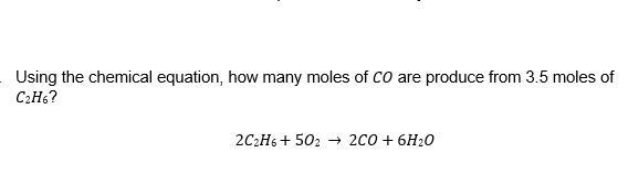 To convert between moles of CO and moles of C₂H₆, you need to use the mole-to-mole ratio. These values are the coefficients in the reaction. Because you are starting with C₂H₆, the coefficient of C₂H₆ should be on the bottom of the ratio to allow for the cancellation of units.
