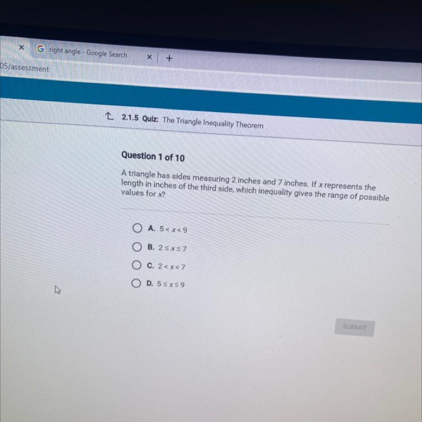 A triangle has sides measuring 2 inches and 7 inches.If x represents the length in inches of the third side, which inequality gi