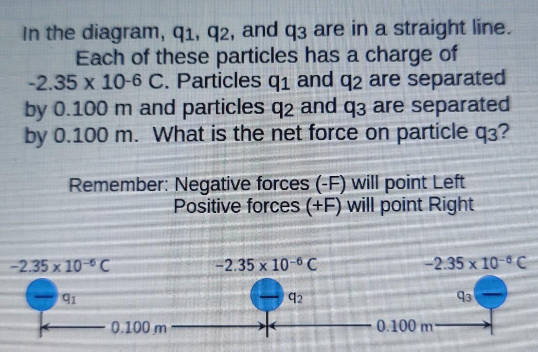 q2 are separated by 0.100 m and particles q2 and q3 are separated by 0.100 m. What is the net force on particle q3? Remember: Negative forces (-F) will point Left Positive forces (+F) will point Right -2.35 x 10-6 C 92 -2.35 x 10-6 C 91 0.100 m -2.35 x 10-6 C 93 0.100 m​