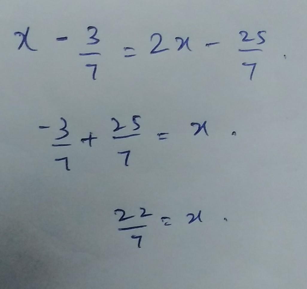 What is the solution for x in the equation? x-3/7=2x-25/7