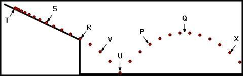 The picture shows the position of the mass at equal time intervals starting from rest at T. The height of the mass at X is the same as at V.