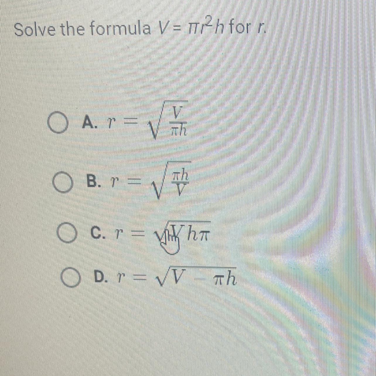 Now plug the values of Volume and r into equation of volume