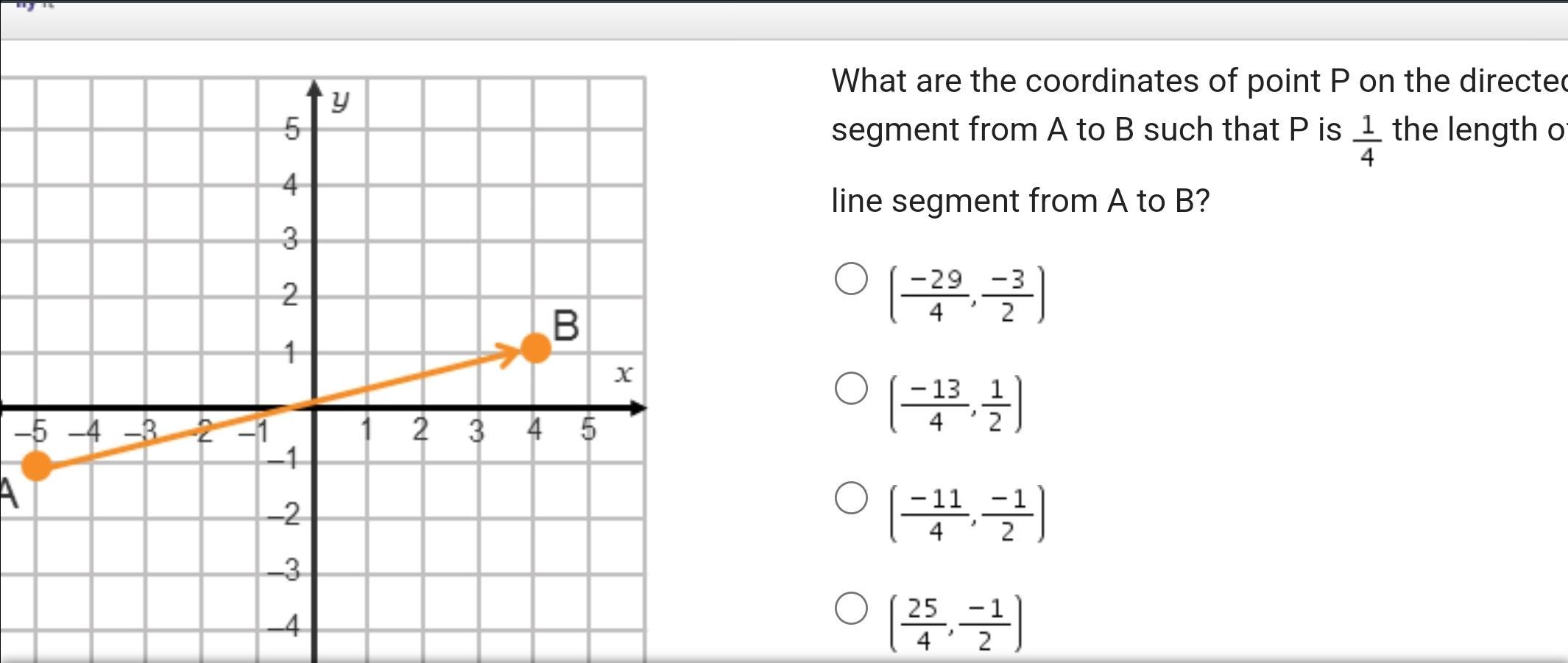 The coordinates of the point P on the directed <em>line</em> segment from A to B such that P is one-fourth the length of the <em>line</em> segment is P(x, y) = (- 2.75, - 0.5). (Right choice: C)
