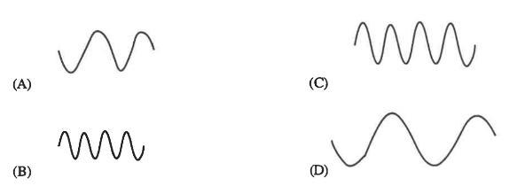 A has less energy and lower frequency, while B has greater energy and higher frequency.
