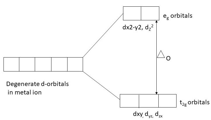 In octahedral complex, under the influence of ligand field, degenerate five d-orbitals split into two sets of orbitals -one is