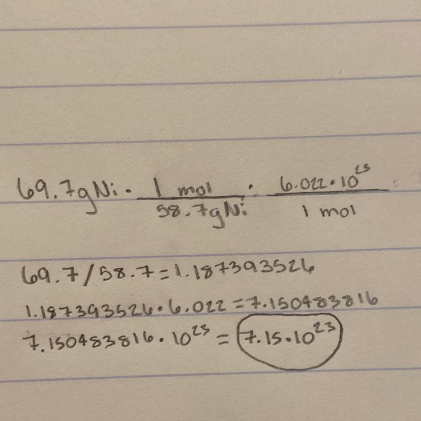 69.7gNi x 1mol/58.7gNi x 6.022•10^23/1 mol = 7.15 x 10^23