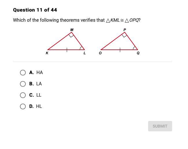 The HA theorem also known as the Hypotenuse angle theorem is used to prove that ΔKML≅ΔOPQ.
