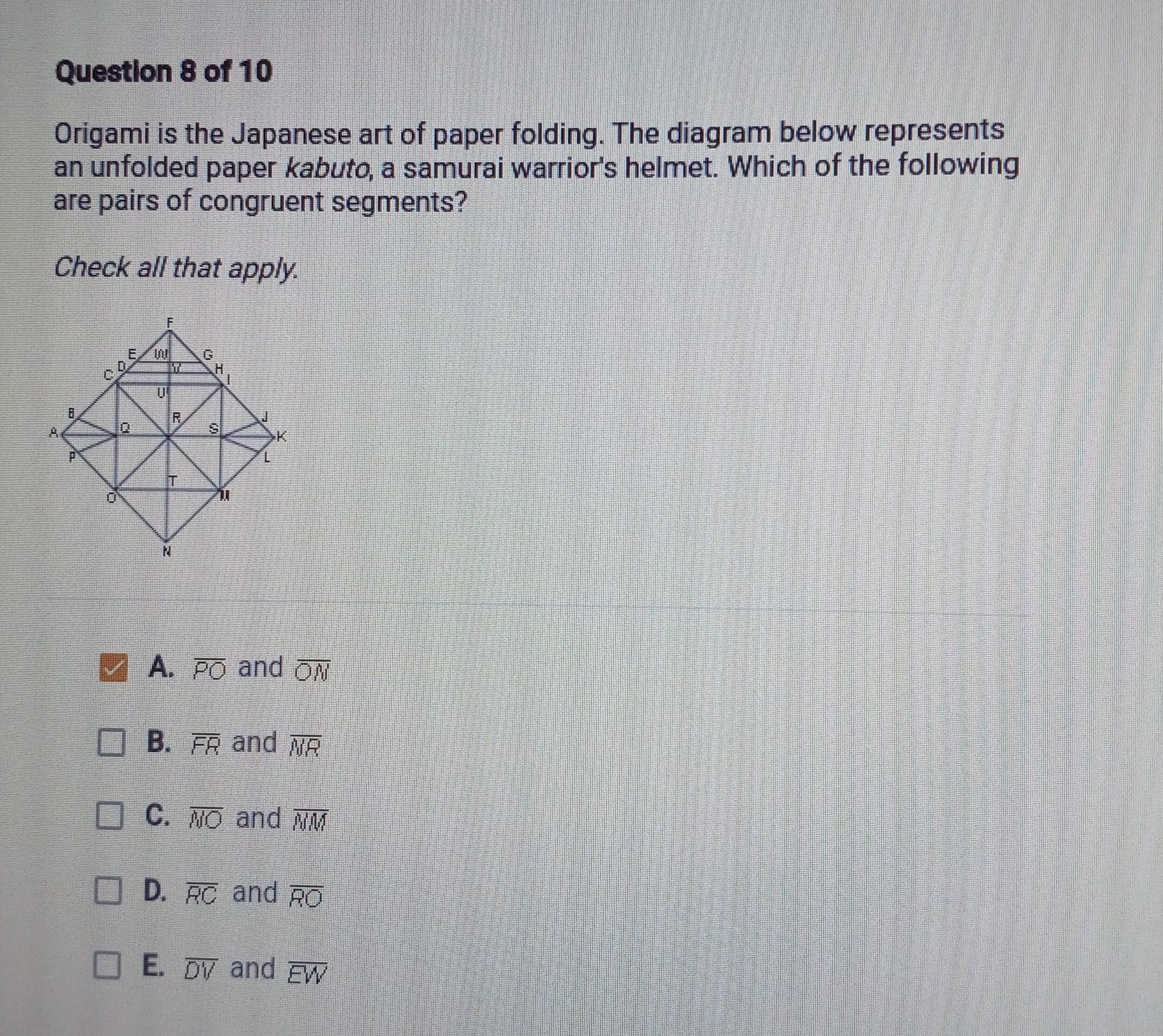 Which of the following are pairs of congruent segments? Check all that apply. A. PO and ON B. FR and NR C. NO and NM D. RC and RO E. DV and EW​