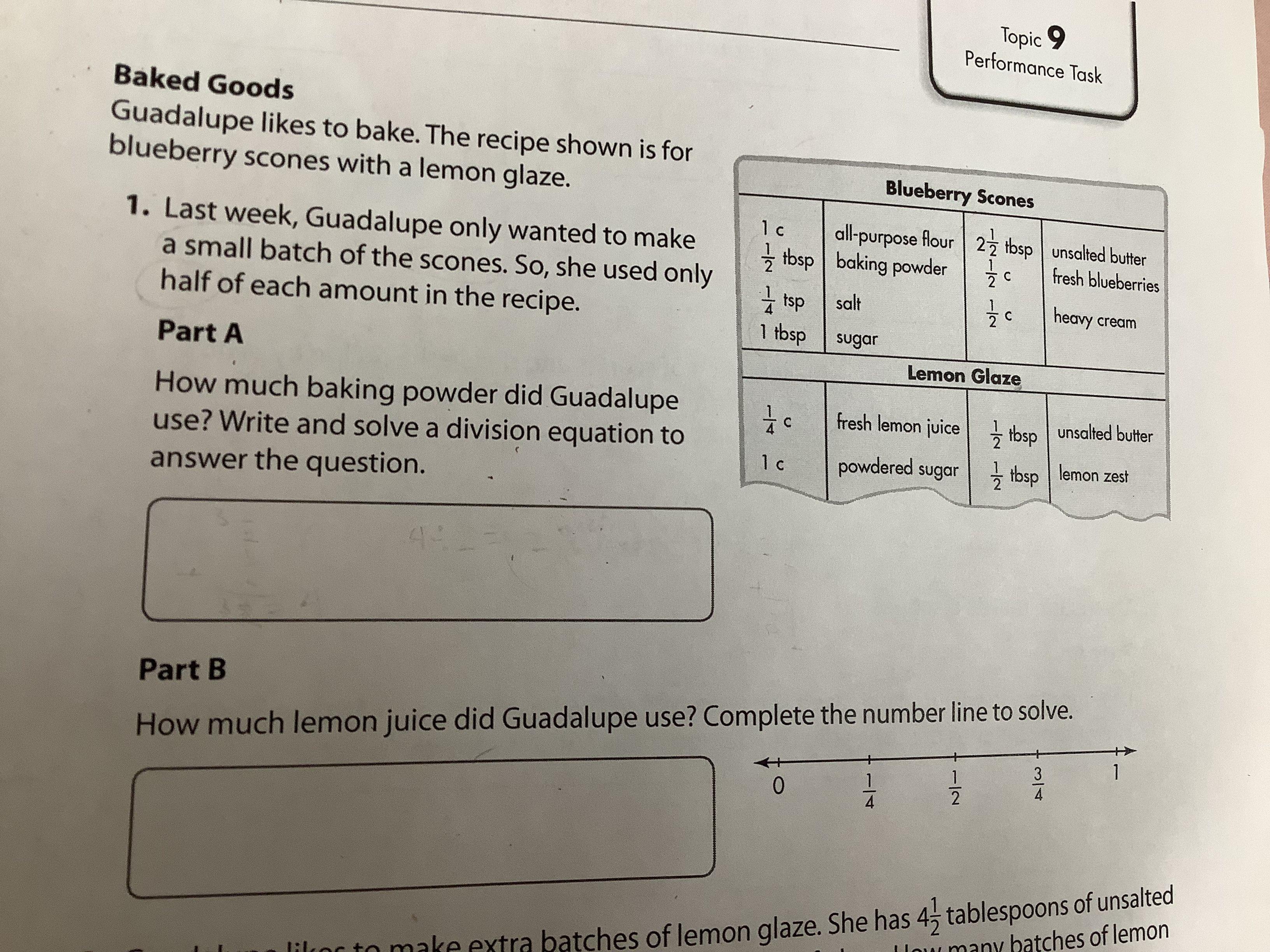 For the lemon juice, the equation is 1/4 divided by 2. On the number line, make a dot at 1/4, and then travel backwards halfway. 1/4 divided by 2 is 1/8, or 0.125.