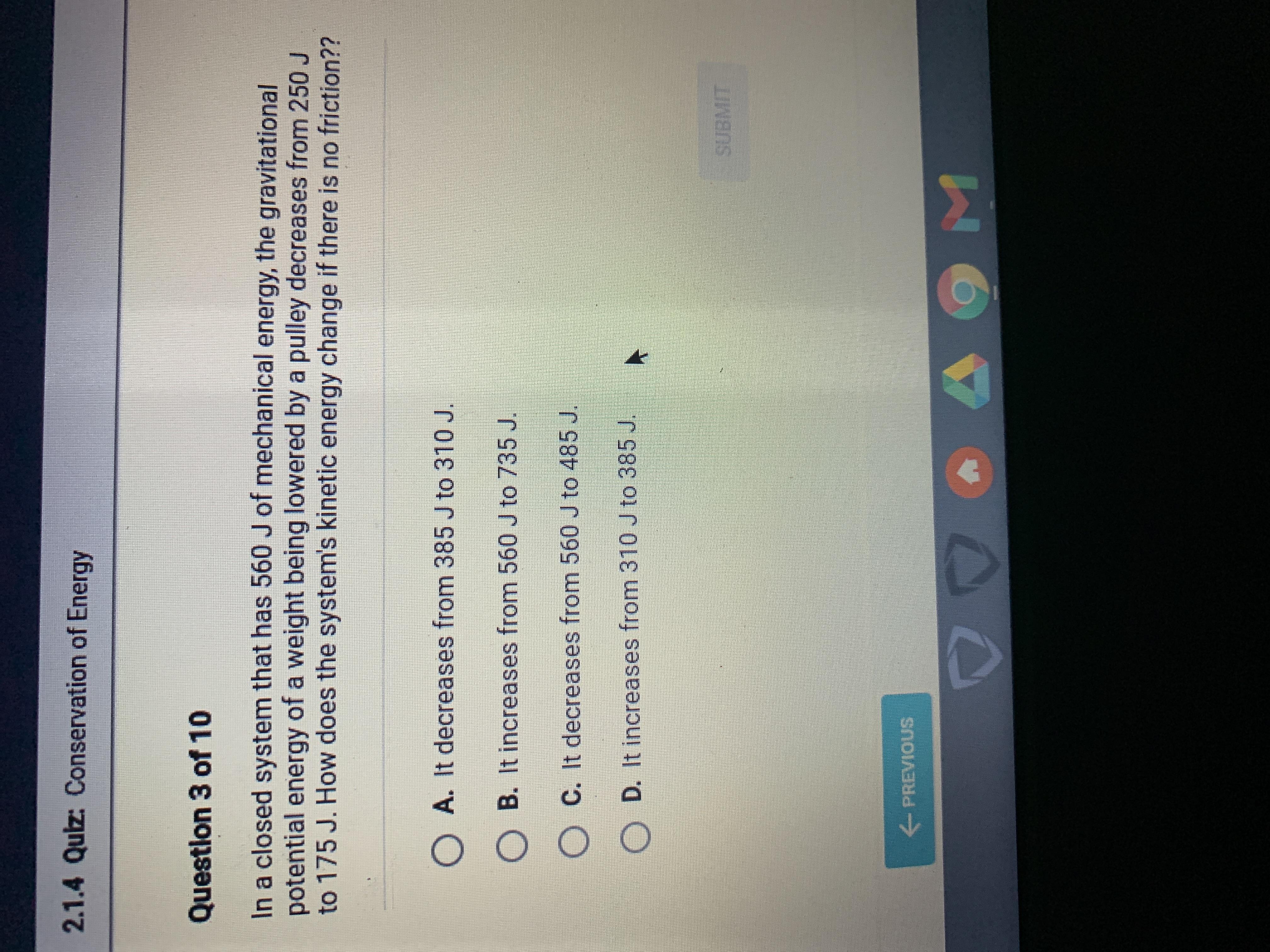 In a closed system that has 560 J of mechanical energy, the gravitational potential energy of a weight being lowered by a pulley decreases from 250 J to 175 J.