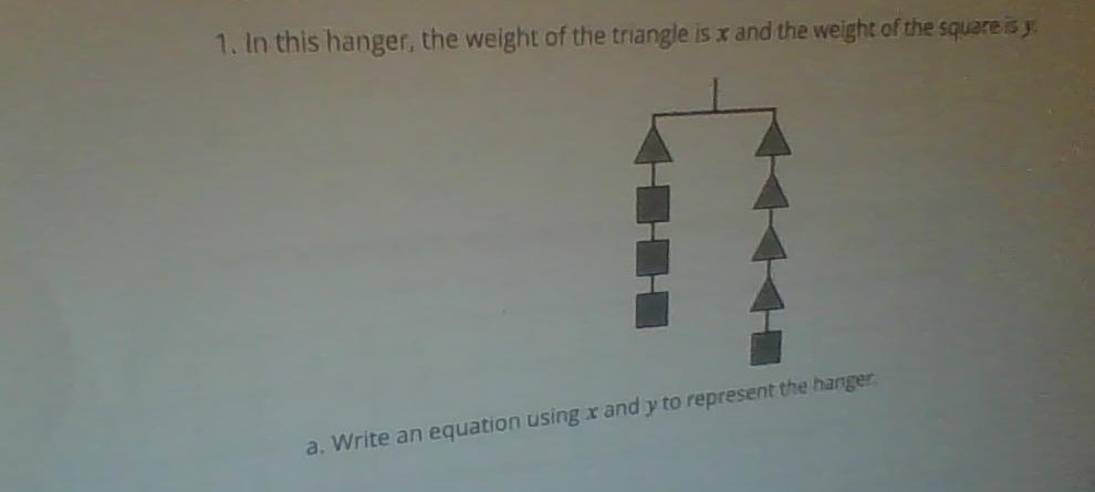 The left side shows 1 triangle and 3 squares. x and y are defined as the weights of the triangle and square, respectively, so the weight on the left side can be represented as ...