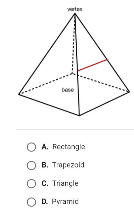 It’s D!!! Pyramid pls give brainliest it can’t be triangle cause triangles r 2D and pyramids are 3R