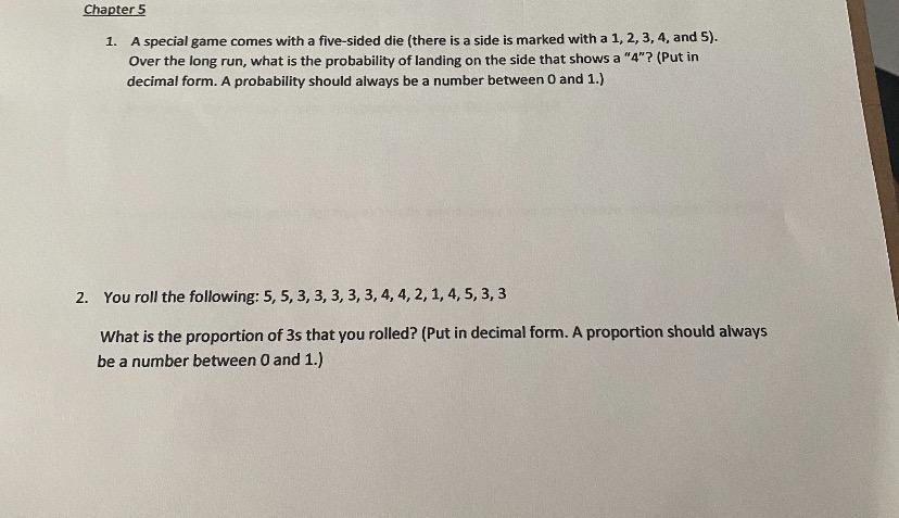 The probability that a 4 shows up is 0.20 and the proportion of 3's rolled is 0.467