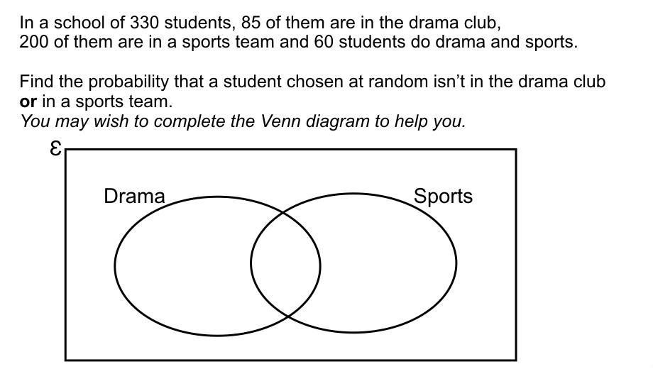THE PROBABILITY THAT A STUDENT CHOSEN AT RANDOM ISNT IN DRAMA OR SPORTS is 7/22.