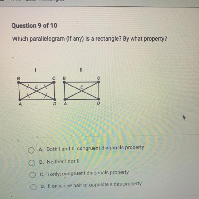 Out of the two parallelograms shown, we can say that A. Both I and II; congruent diagonals property.