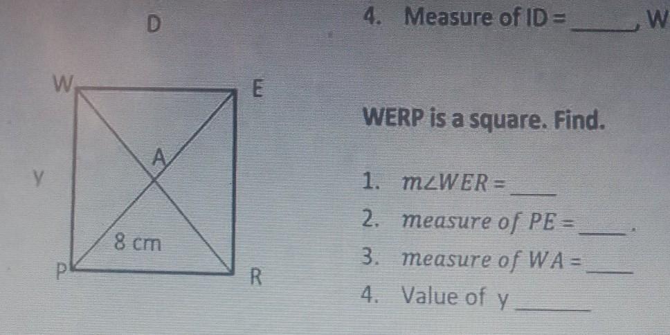1) All interior angles of a square are right angles, so angle WER measures 90°