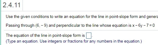 The slope of the equation given is 1/6. Since the point-slope form line is perpendicular to that, the point-slope form equation must must have a slope that's the negative <span>reciprocal </span>of 1/6, so it must have a slope of -6.