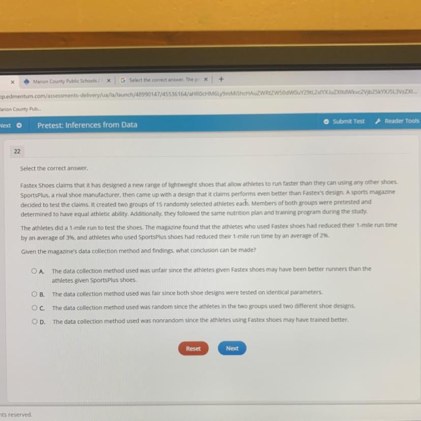 Thus, we can make a conclusion about the data collection method used was fair since both shoe designs were tested on identical parameters option (B) is correct.