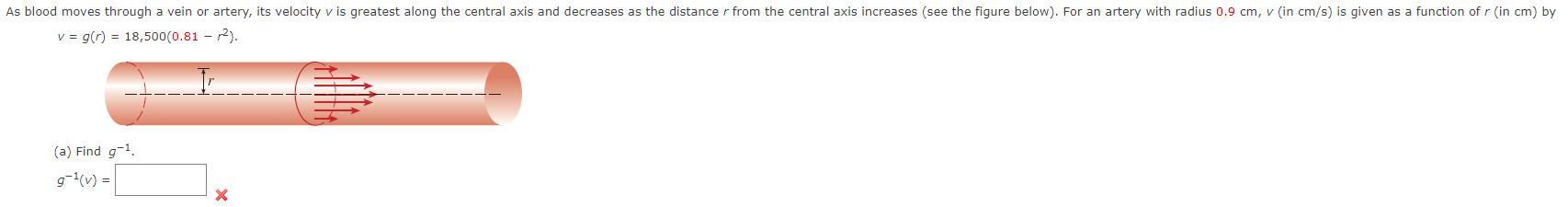 the central axis increases (see the figure below). For an artery with radius 0.9 cm, v (in cm/s) is given as a function of r (in cm) by v = g(r) = 18,500(0.81 − r^2). Don't bother answering if you won't show work, (I care more about learning how to than knowing the answer :))
