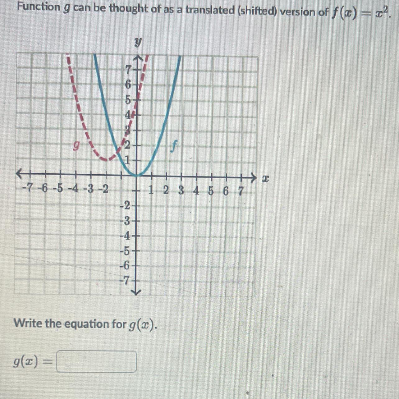 G(x) is left 2, up 1 from f(x). So, g(x)=f(x+2)+1. Or, you can say g(x)= (x+2)^2 + 1.