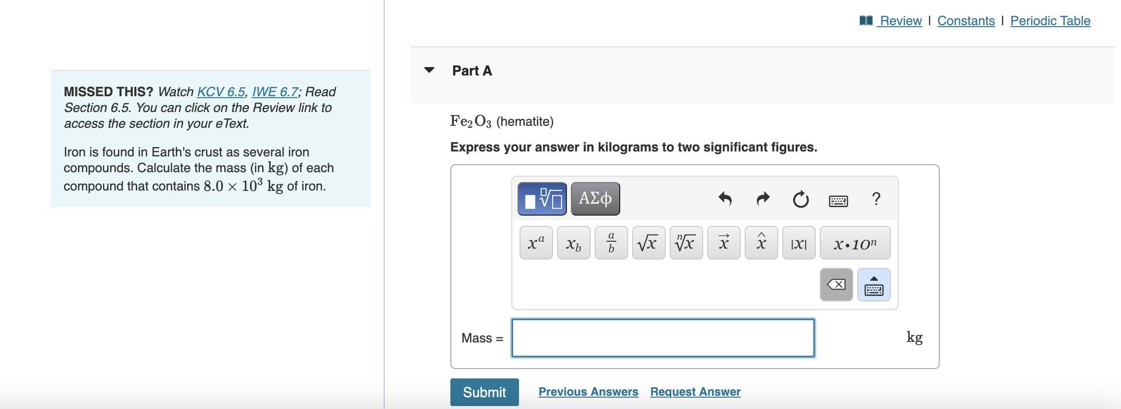 The mass of hematite that contains 8.0×10³ kg of iron = 8.0 × 10³kg/0.35 = 2.29 × 10⁴ kg.
