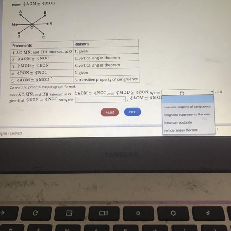 Since AC, MN and DB intersect at O, ∠AOM ≅ NOC and ∠MOD ≅ ∠BON by the vertical angles theorem. It is given that ∠BON ≅ ∠NOC, so by the transitive property of congruence, ∠AOM ≅ ∠MOD