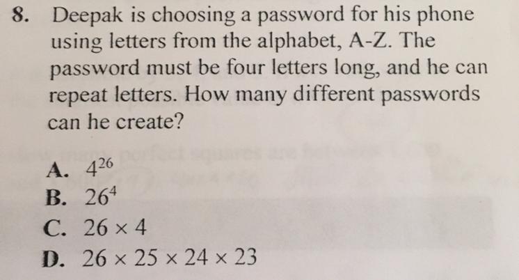 Deepak is given the choice of picking a four letter password of his liking, using any four letters. Since the letters he uses can be repeated, it is 26 * 4 possibilities, since there are 26 different possibilities of letters from the alphabet he could choose, for 4 times. Also, since letters can be repeated, 26 stays the same. If letters could not be repeated, it would be 26 * 25 * 24 * 23.