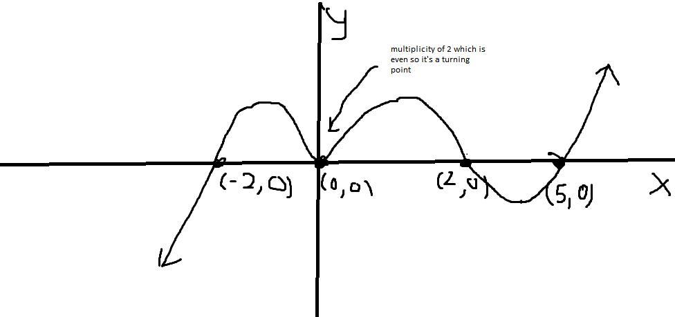 So if you were to expand out the x's you would have x^2 * x * x * x which will result in x^5. and because the leading coefficient is positive, it will be going towards positive infinity as x goes towards positive infinity, and because the degree is odd the end behaviors will be opposite, so as x goes towards negative infinity the value of f(x) will be going towards negative infinity. One other thing to note is that because x^2 technically is two zeroes, with the same value, the zero at x=0 has a multiplicity of 2, meaning that it will not cross the x-axis, but rather have a turning point, once it intersects the x-axis, because the zero has an even multiplicity. Given this information we can draw a graph. So as you can see in the graph, it will sometimes be negative and sometimes positive