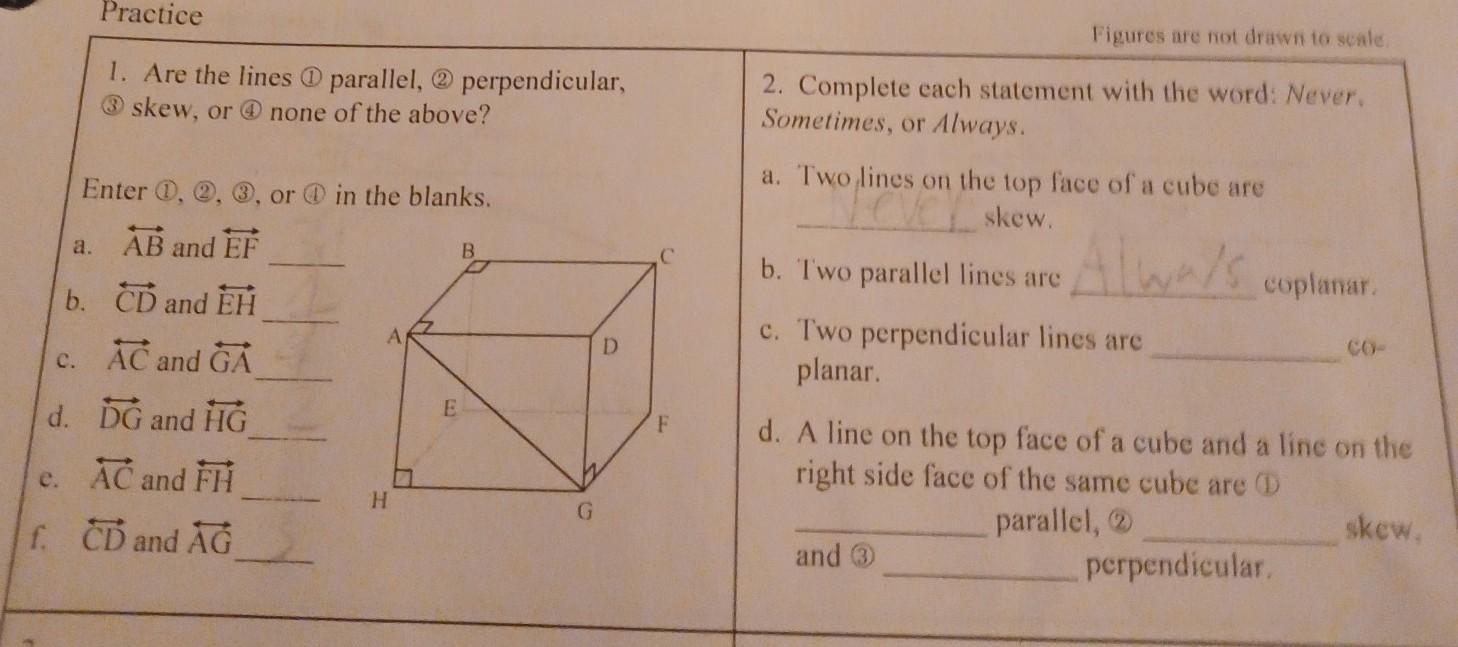 <u>2.d.</u><u> A line on the top face of a cube and a line on the right side face of the same cube are </u><u>sometimes </u><u>parallel, </u><u>sometimes</u><u> skew, and </u><u>sometimes</u><u> perpendicular</u>