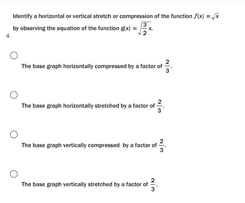 By applying the concept of transformation, the <em>transformed</em> function g(x) = √[(3/2) · x] is the consequence of applying a <em>stretch</em> factor of 2/3 on the <em>parent</em> function f(x) = √x. (Right choice: C)
