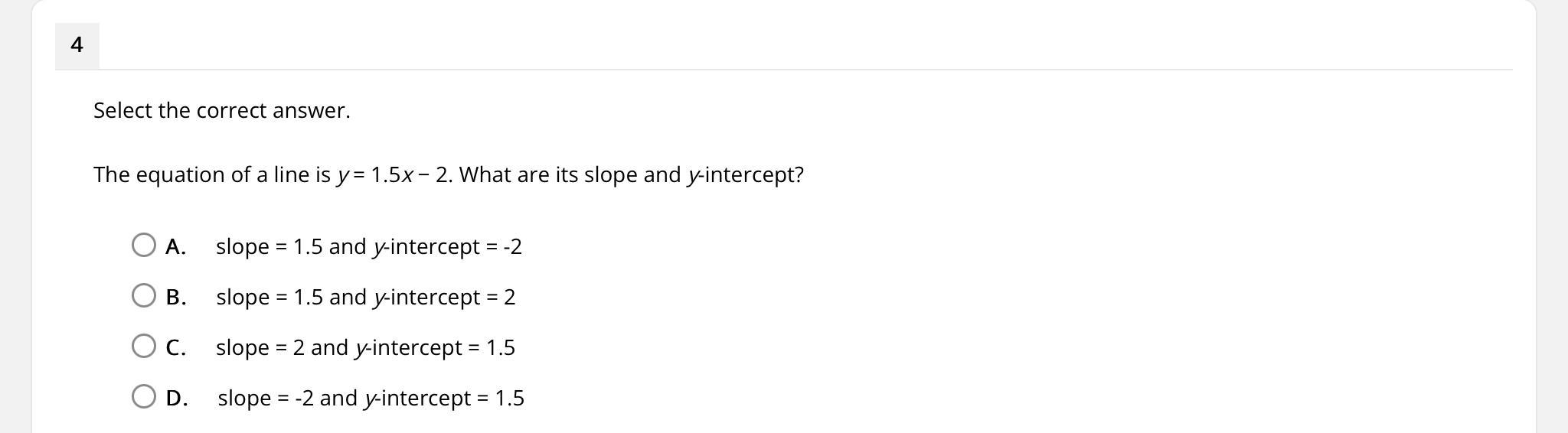 "<u><em>What is the slope & y intercept of the equation y=1.5x-2?"</em></u>