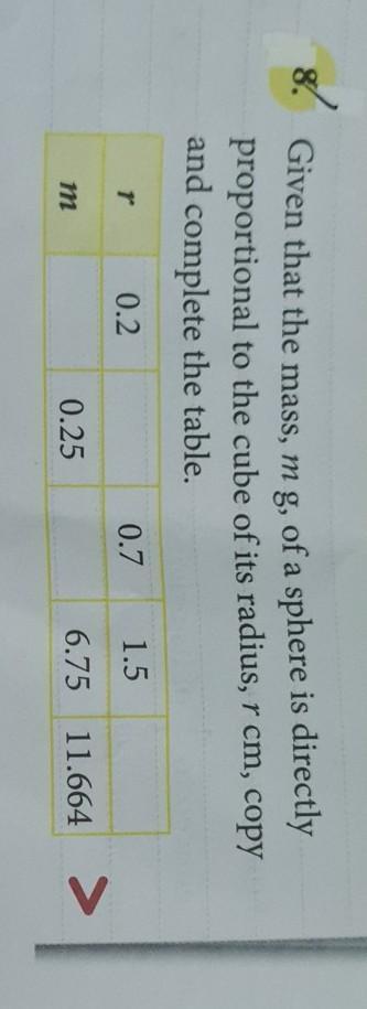 The problem says "... the mass, <em>m</em> g, of a sphere is directly proportional to the cube of its radius, <em>r</em> cm...", so our equation will look like