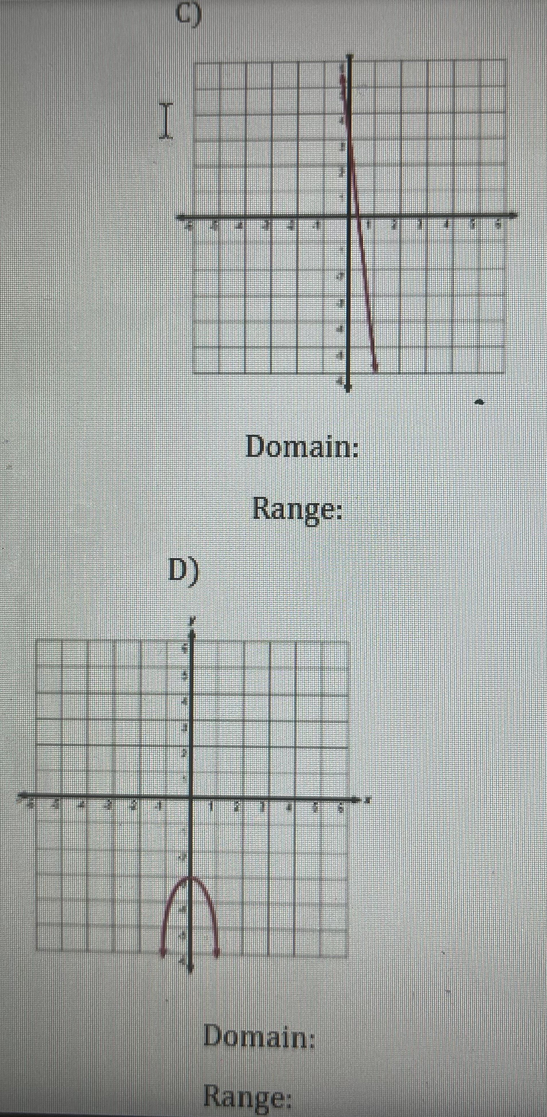 <h2>C)</h2><h3>Domain: ( - ∞ , ∞ ) or ] -∞ , ∞ [</h3><h3>Range: ( - ∞ , ∞ ) or ] -∞ , ∞ [</h3>