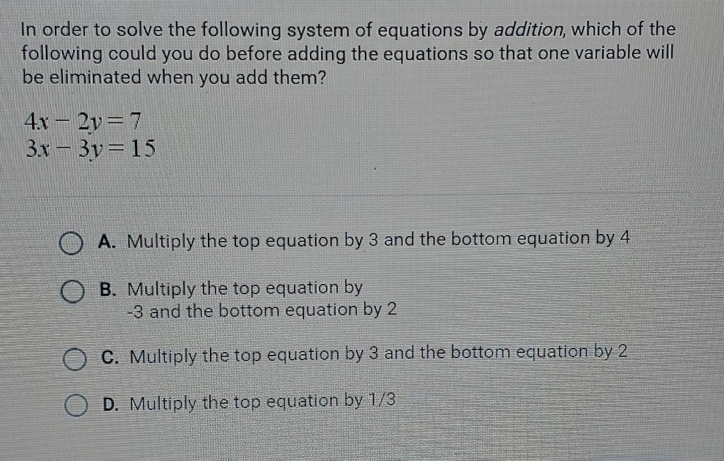 The simplest "no brainer" solution is to use the coefficients of one of the variables, negating one of them. Multiply each equation by the opposite equation's coefficient. Here, the y-coefficients are -2 and -3, and the multipliers of answer choice B are -3 and 2, consistent with this advice. (The sign of 2 was changed.)