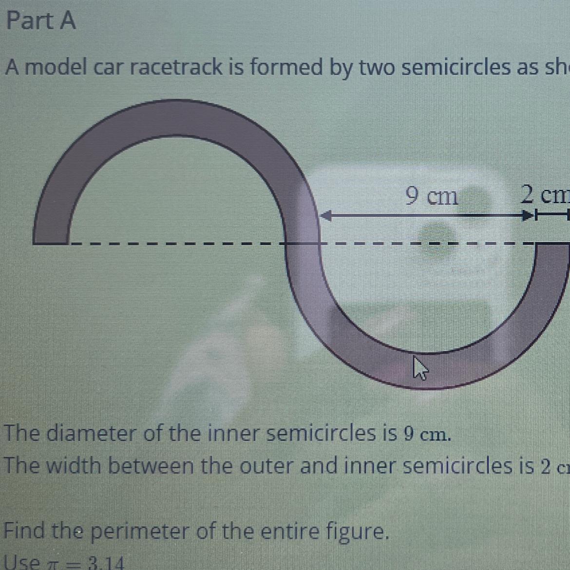 Given, that the diameter of the inner semicircles is 9 cm and the width between the outer and inner semicircles is 2 cm.