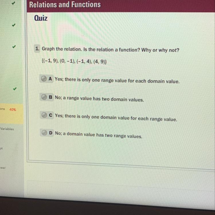 I believe that the answer is D because domain values are the x-coordinates and there are two -1 x-values that have different ranges (y-values)
