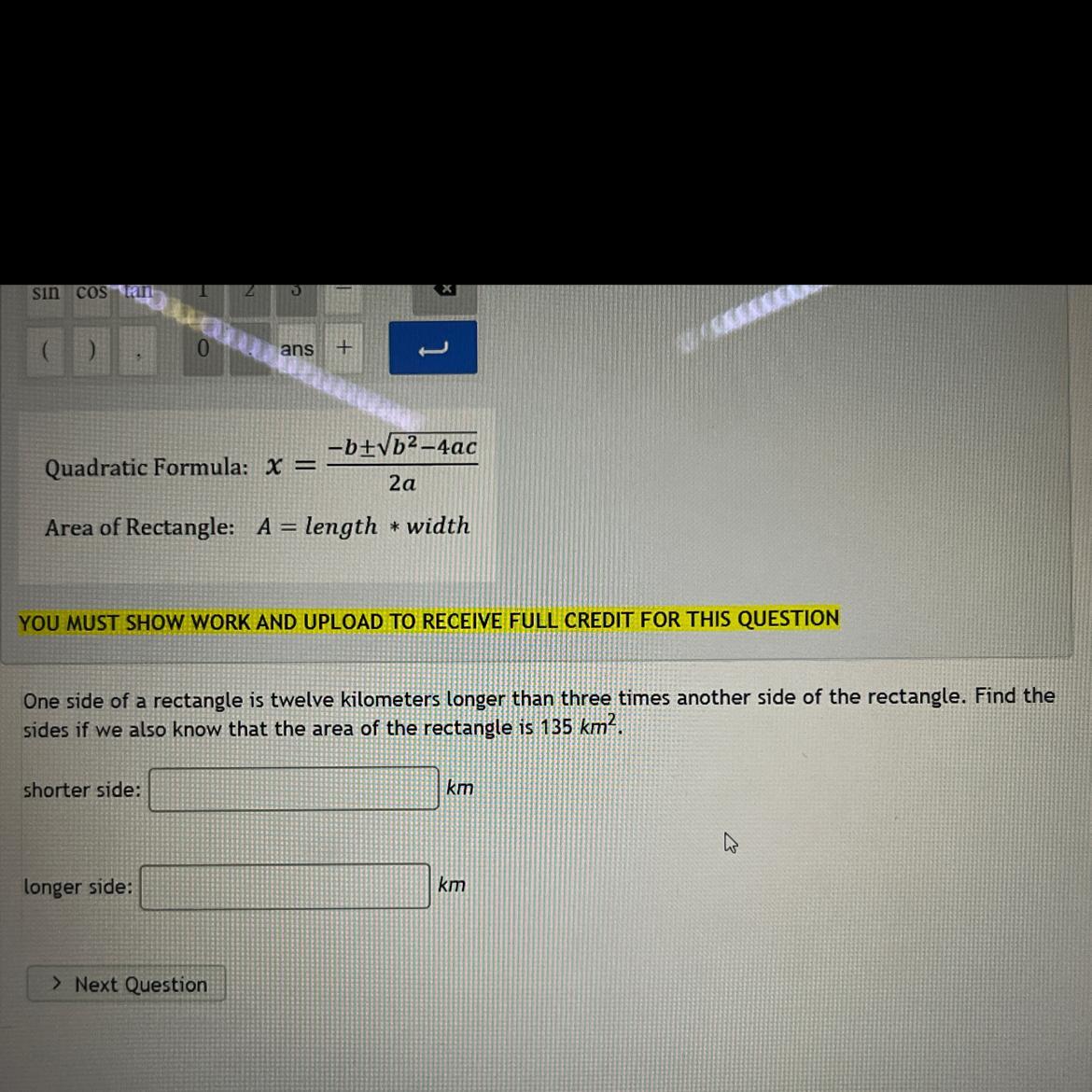 "Known" Values: one side=x, other side=3x+12, area=135 km^2