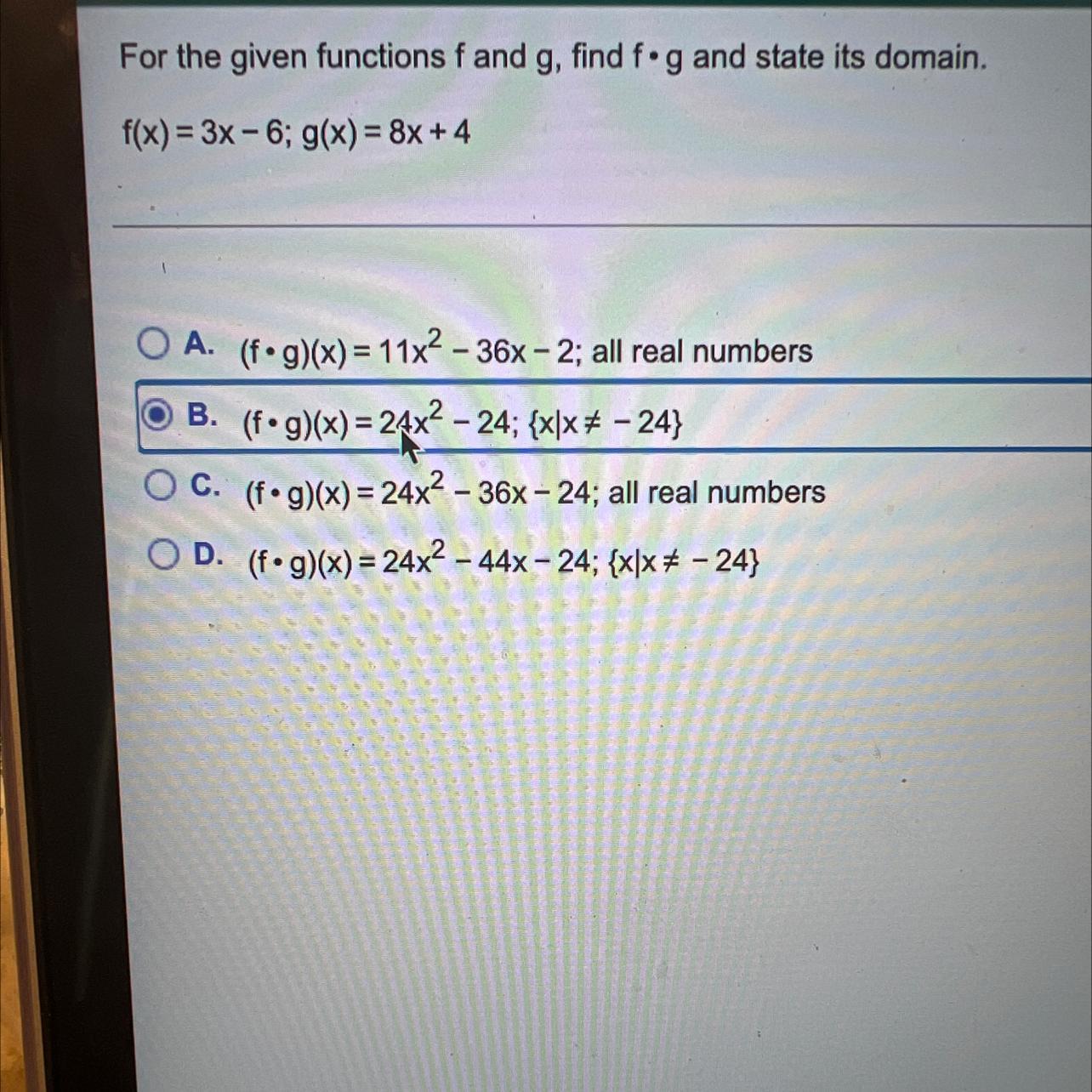 Therefore, f.g and its domain is 24x²-36x-24; all real numbers.