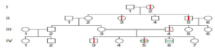 In the pedigree, it is possible to observe that the individual IV5 expresses both syndromes (nail-patella syndrome and alkaptonuria), whereas there is a 1/8 chance that the individual IV2 is a carrier of the nail-patella syndrome.