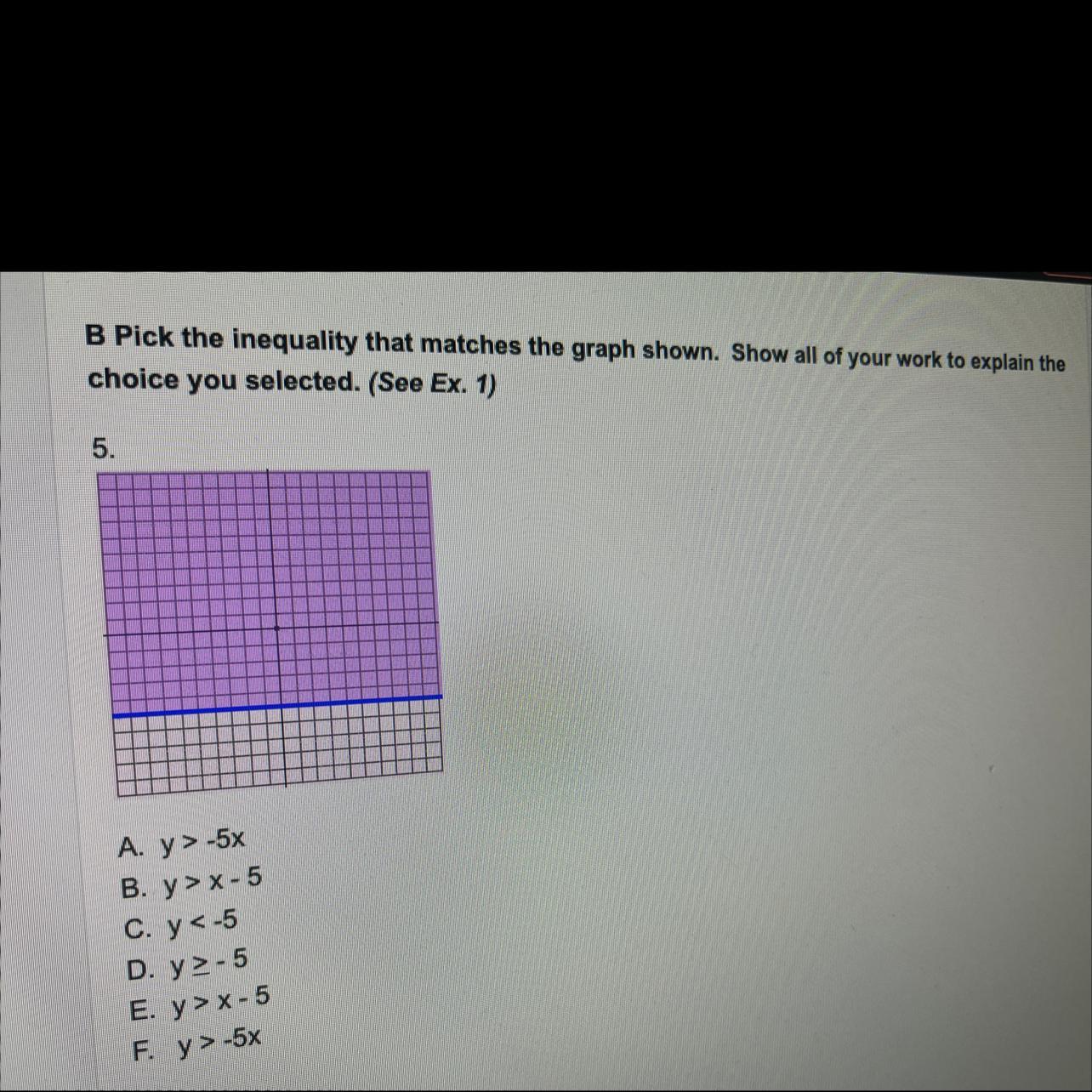 since the graph is shaded above the line, it must be greater than or greater than or equal to, so it must be D) y≥-5.