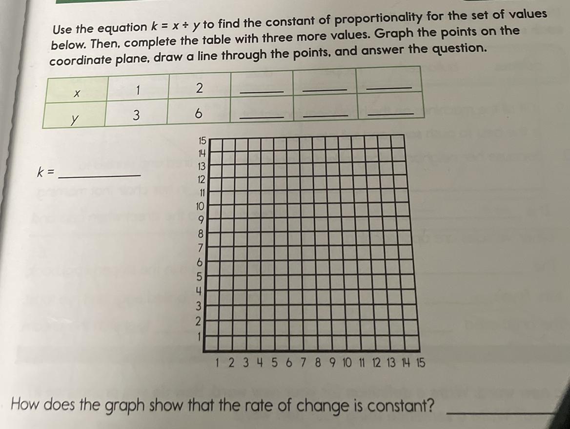 Use the equation k = x÷ y to find the constant of proportionality for the set of values