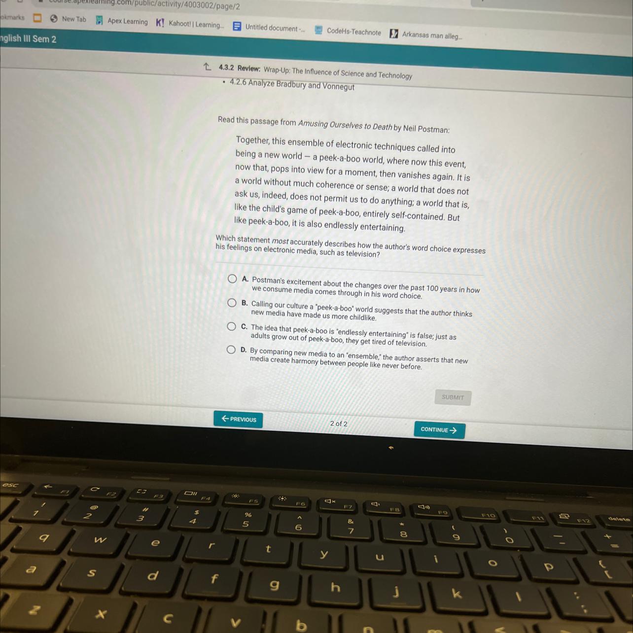 In Neil Postman's "Amusing ourselves," the word "peek-a-boo" suggests that the media, especially television, made people think like children. Thus, option B is correct.