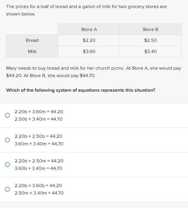 Since at store B, she spends 44.70 and bread costs 2.50 and milk costs 3.40 you get the equation: