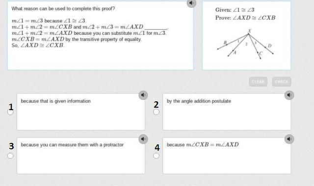 4). m∠CXB = m∠AXD 4).Transitive property of equality