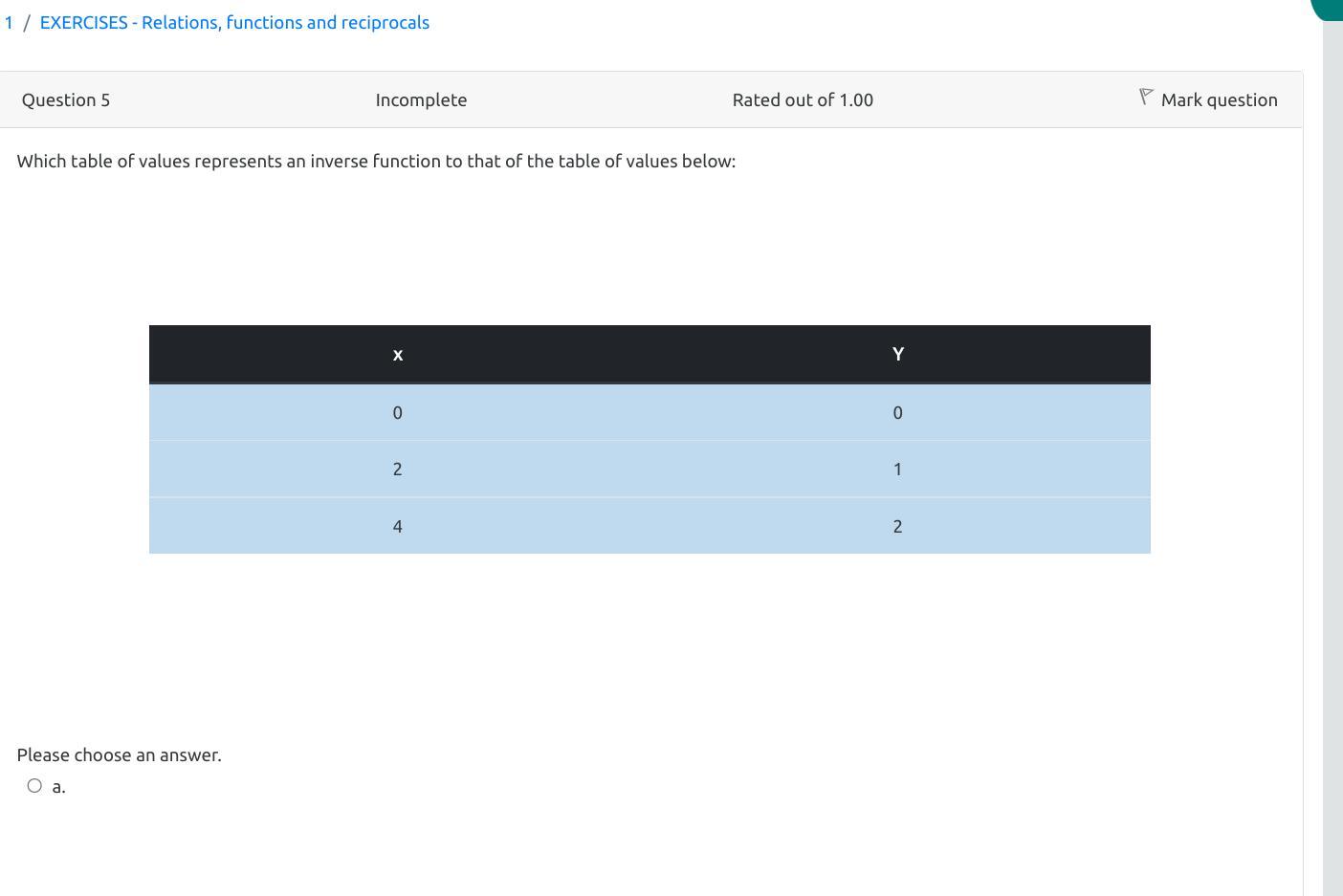 In the table given, we have points (0,0), (2,1) and (4,2), hence the inverse table has points (0,0), (1,2) and (2,4), which is table a.