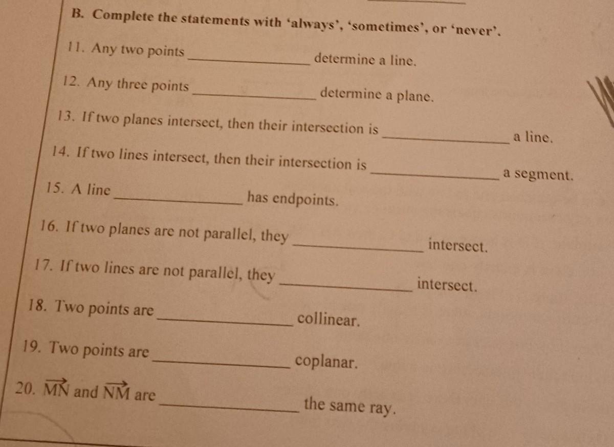 14. If two lines intersect, then they form a point at the intersection (not a segment).