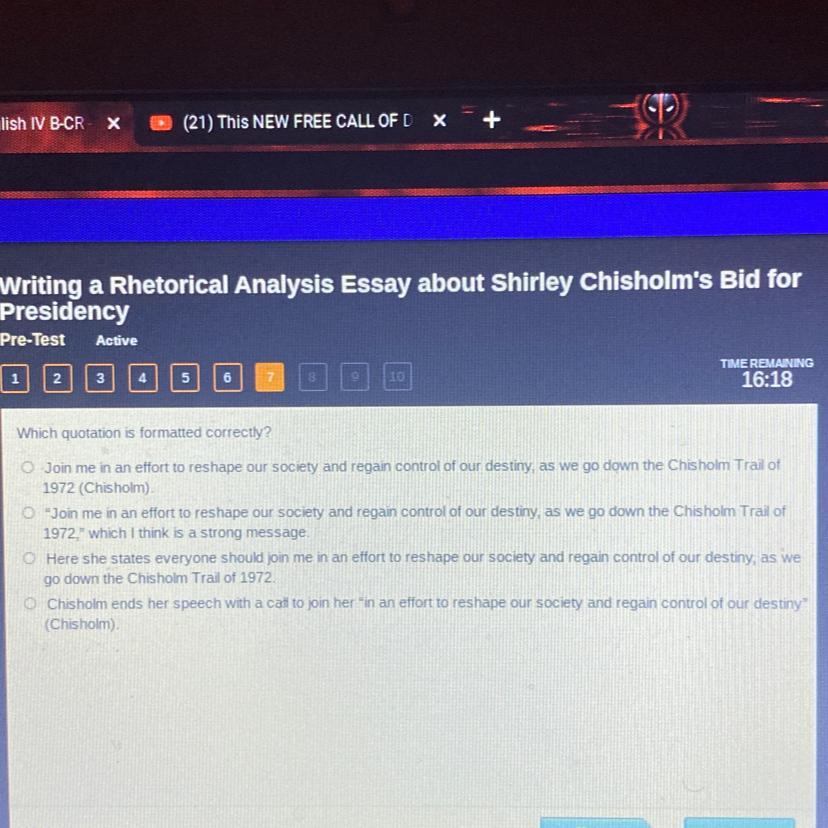 In the above question, the correct format of the context is <em>Here she </em><em>states </em><em>everyone should join me in an effort to </em><em>reshape </em><em>our society and </em><em>regain control </em><em>of our </em><em>destiny</em><em>, as we go down the Chisholm Trail of </em><em>1972</em><em>.</em>