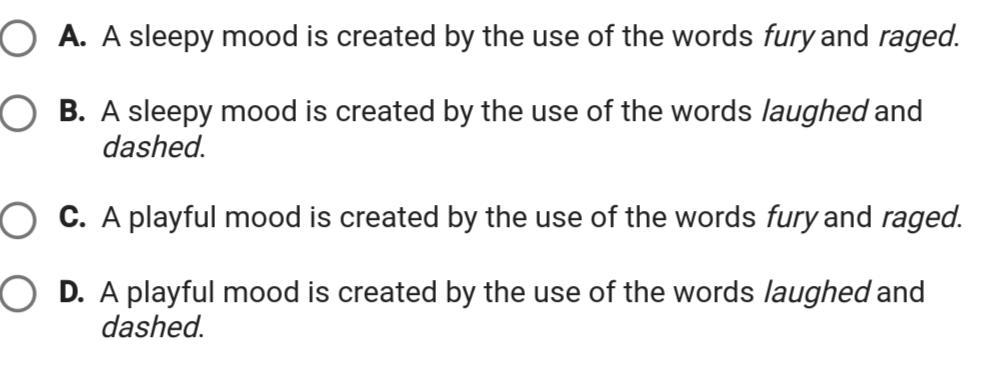 The statement about the word choice and word combination that best supports the mood of the passage at that particular point is the 2nd one (B.),