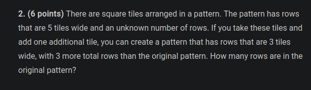 <em>{another way I solved it : [and when it is divided by 3, it has 8 that fit into the original pattern; which is another way of knowing that each of the rows of 5 [each have 2 removed when turned into rows of 3] add up to having a remainder of 8 tiles; 8 / 2 = 4; so there were four rows in the original pattern contributing to the change--</em><em>there were four rows</em><em>] }</em>