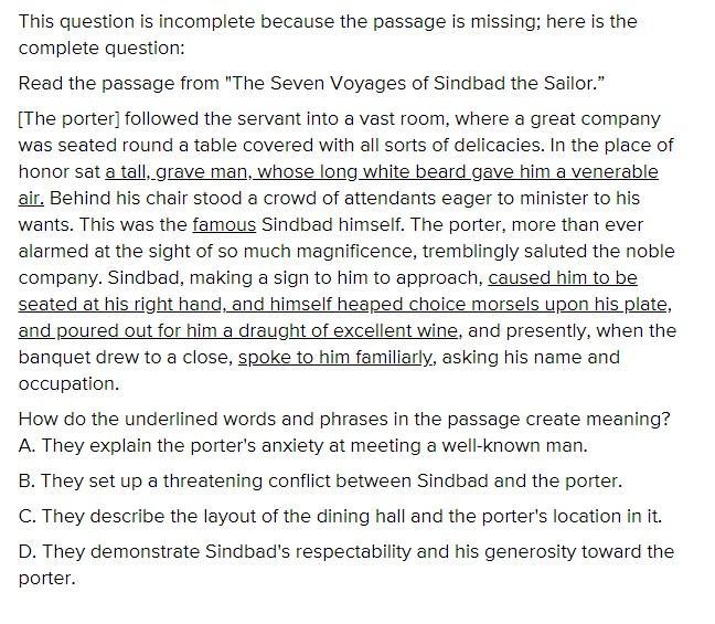 The Seven Voyages of Sindbad the Sailor is an adventurous story of Sinbad. The underlined phrases and words demonstrate Sindbad's humanitarianism and politeness toward the porter. Thus, option D is correct.